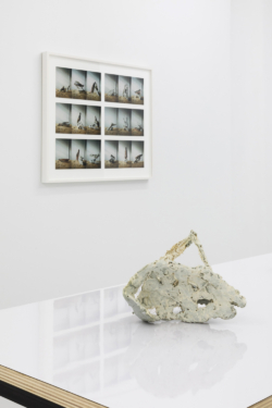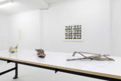 [In Schoerner’s photographs] every work consists of three different kinds of objects. Schoerner photographs one by itself (A), then he photographs it with the next object (AB), and then he photographs the second object with the third object (BC), going on to repeat the approach so as to capture every possible combination: ABC, CAB, BCA, ACB, BAC, CBA, etc. In the present photographs Schoerner approaches Lindman’s sculptures in the same way as the household items he has been photographing: systematically exploring them from every possible position in such a way that immediately reads as serial and exhaustive… Schoerner’s photographs of Lindman’s sculptures propose a simultaneity that is implied by the works, but which transcends the ability of any one person to perceive in a single glance, as the grid of photographs makes possible.”